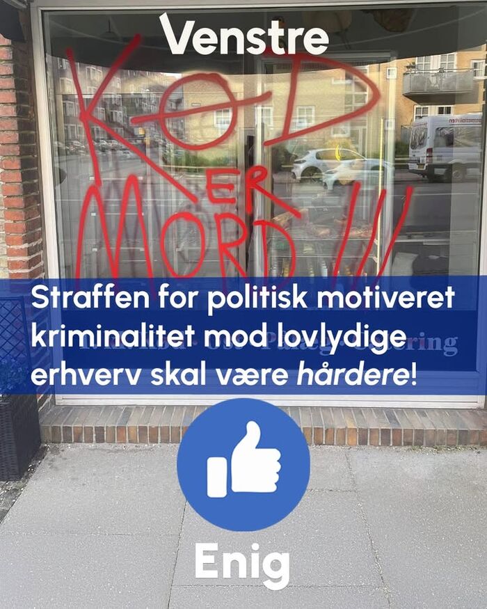 Sidste år besøgt Jan E. Jørgensen en lille slagterbutik på Amager, som bliver hærget af veganske aktivister. Vi vil ikke acceptere, at aktivister forsøger at presse andre ud af deres levevej ved at skabe frygt og utryghed! Derfor vil vi skærpe straffen ved politisk motiveret kriminalitet mod lovlige erhverv 👍